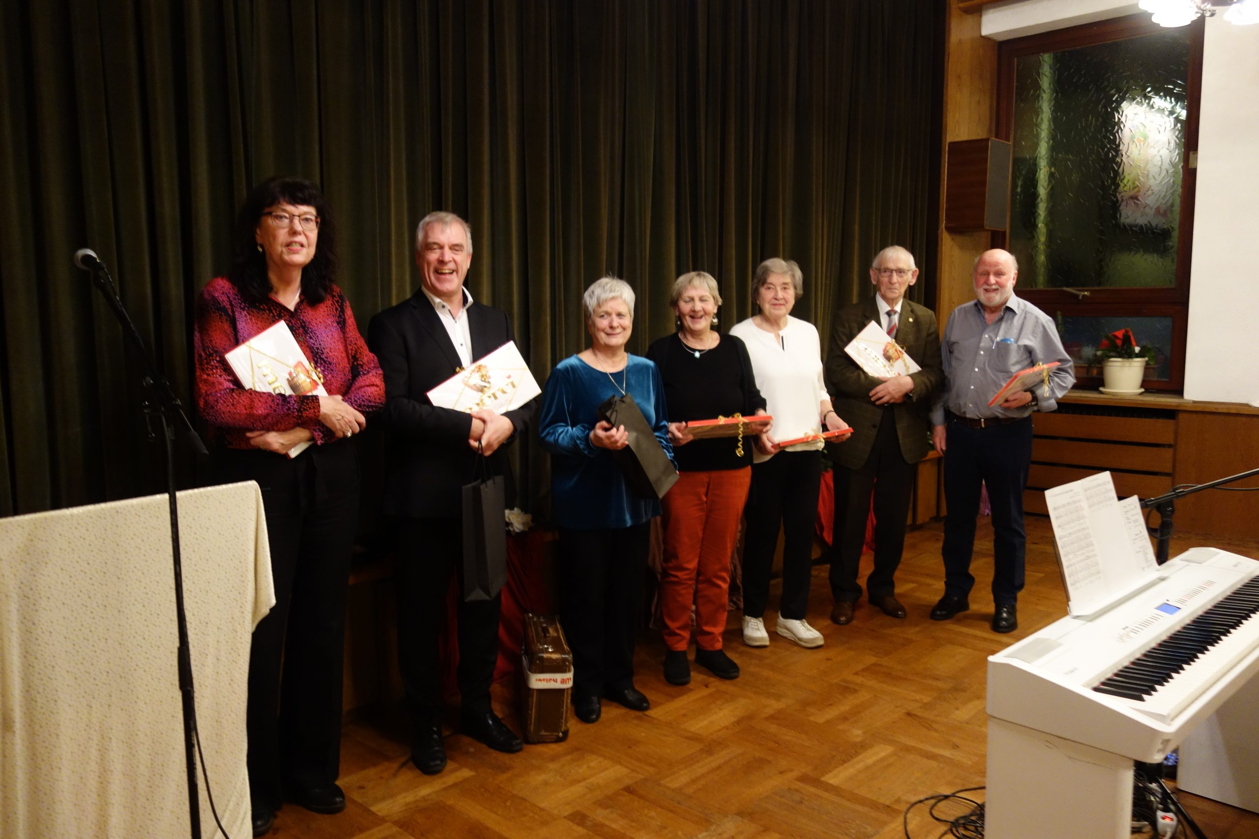 Im Rahmen dieser Feier konnten wieder einige Mitglieder geehrt werden. Leider konnte die Sängerin Maria Moritz wegen Krankheit nicht anwesend sein. Leon Meyer und Thomas Scheier vom Chorverband Pforzheim/Enzkreis waren trotzdem gekommen um der Vorsitzenden die Goldene Ehrenbrosche und Urkunde des Badischen Chorverbandes für 50 Sängerinnenjahre zu überreichen, die die Sängerin dann zu einem späteren Zeitpunkt erhalten wird.